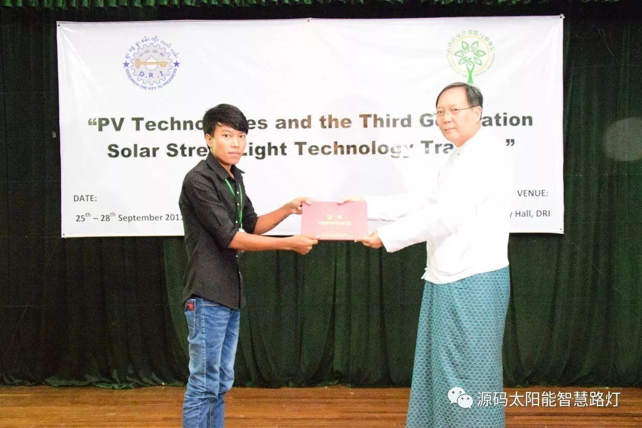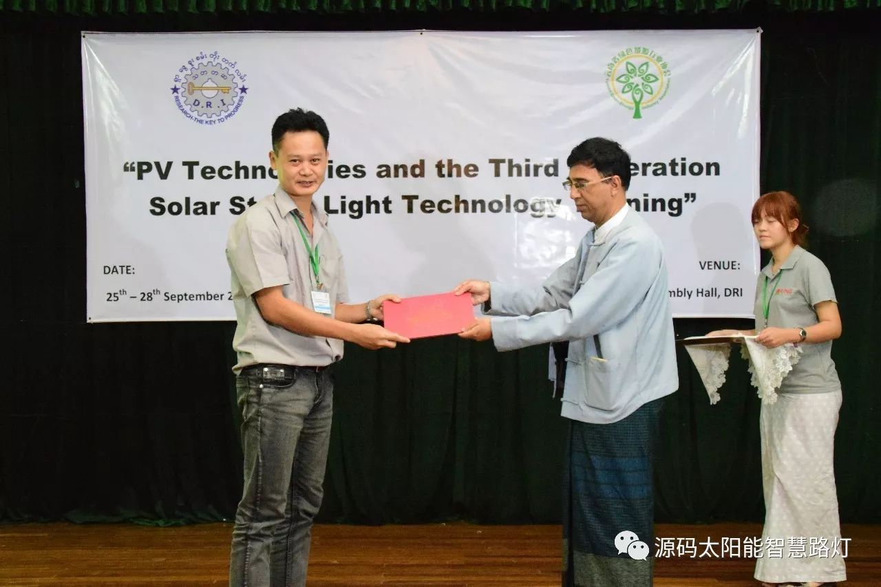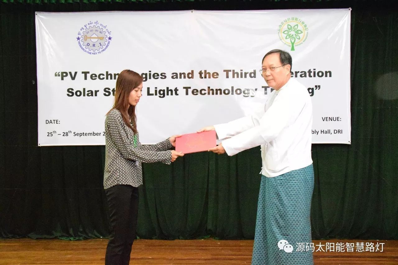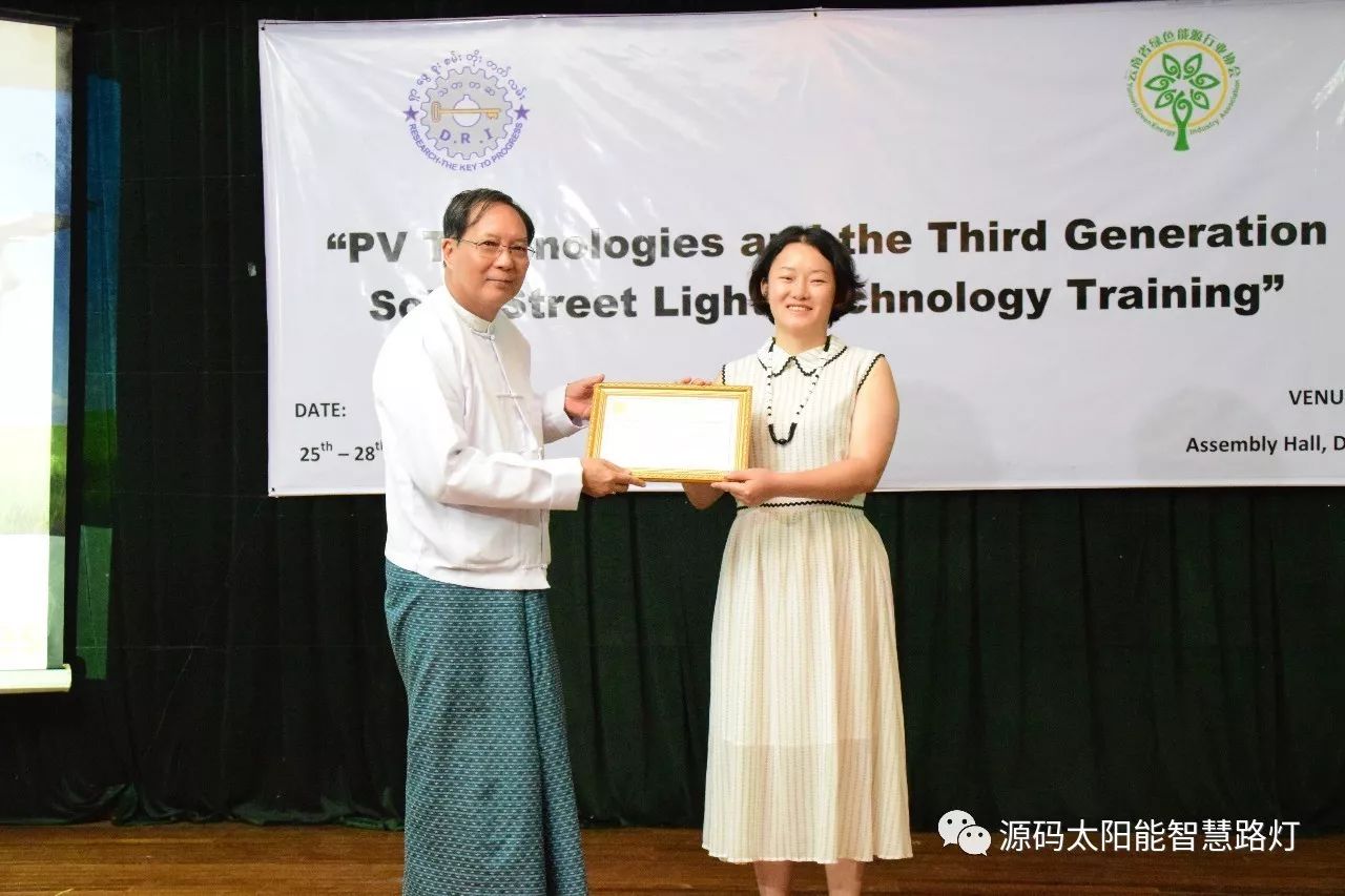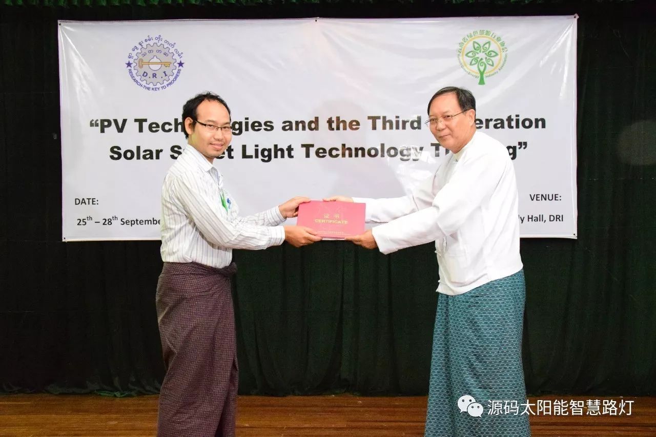 在培訓會議后,大家對此次的培訓綜合內容及取得的效果進行了深入研討,參與此次培訓的能源部、政府部門的相關人員以及大學教授、企業代表都對此次培訓會的效果表示滿意,也希望以后能有更多的類似的培訓會,源碼也希望在以后的培訓中能夠給他們帶來更好的效果。研討會后,中國駐緬甸大使館領導對本次會議作了總結:對本次培訓會議的培訓方云南省綠色能源行業協會以及源碼太陽能智慧路燈表示感謝,表示此次會議對雙方的技術交流學習以及中緬兩國友誼的加深都取到了十分良好的效果。接著緬甸教育部科技司司長則親自向所有通過考試的學員頒發了證書,在頒獎過程中,源碼也向緬甸教育部科技司捐贈了兩套太陽能智慧路燈。
