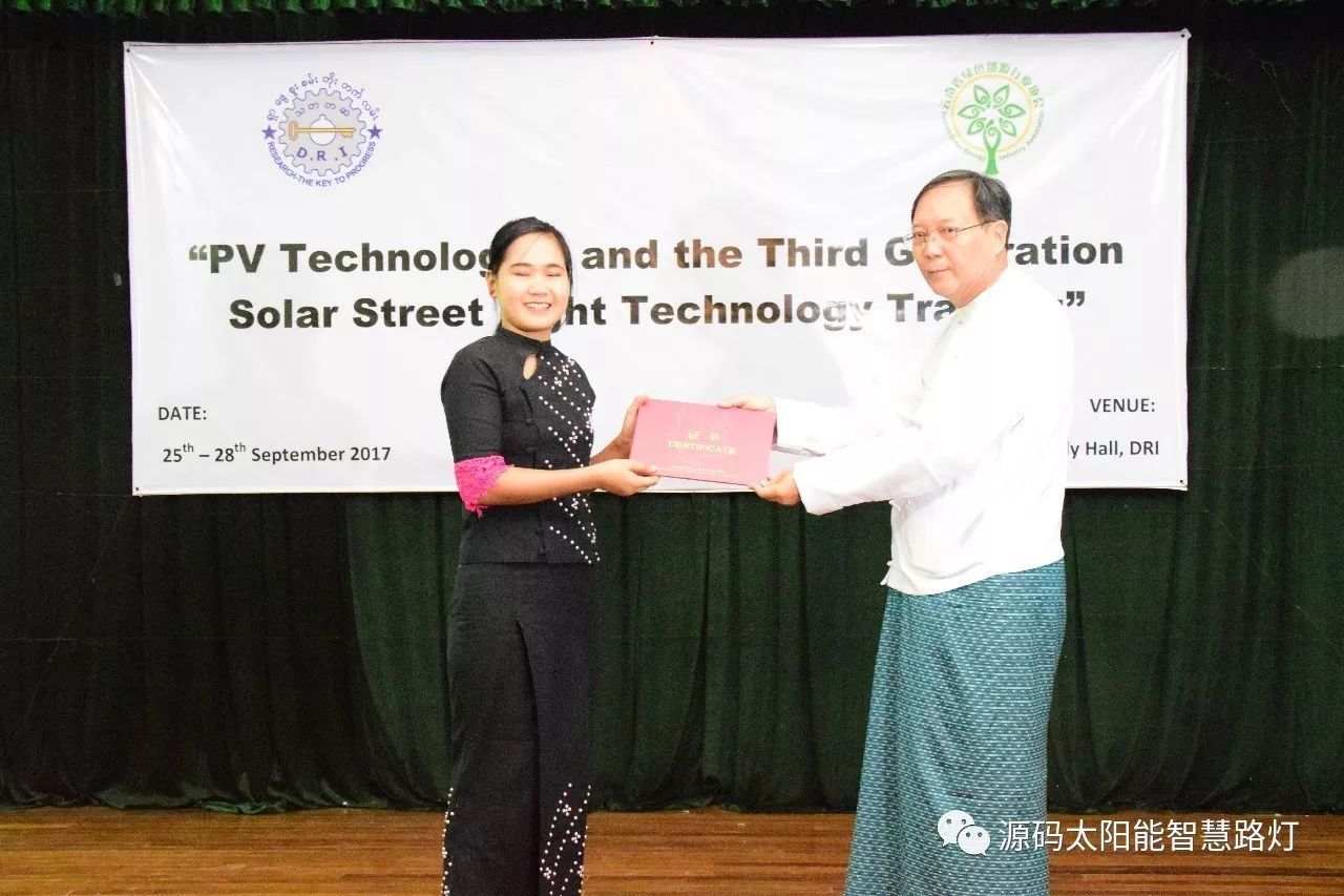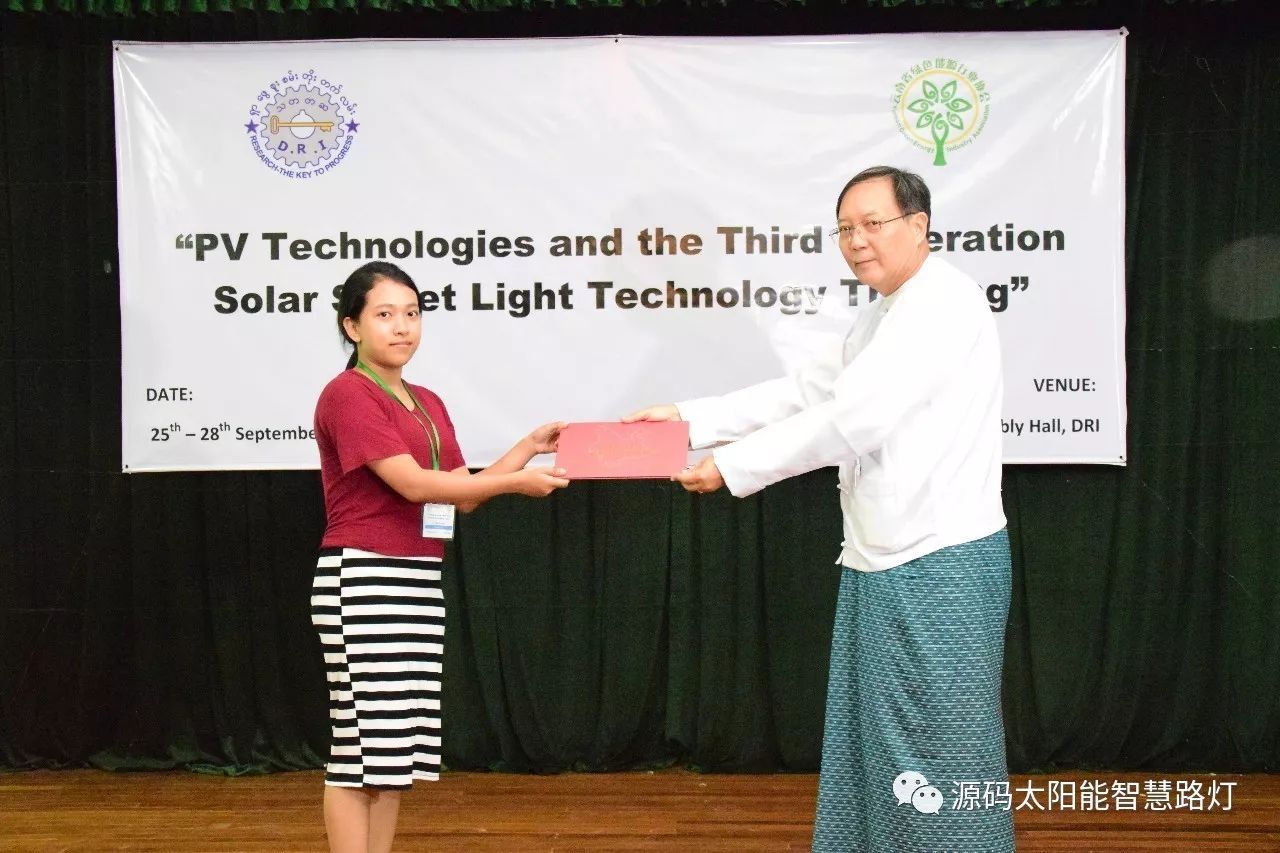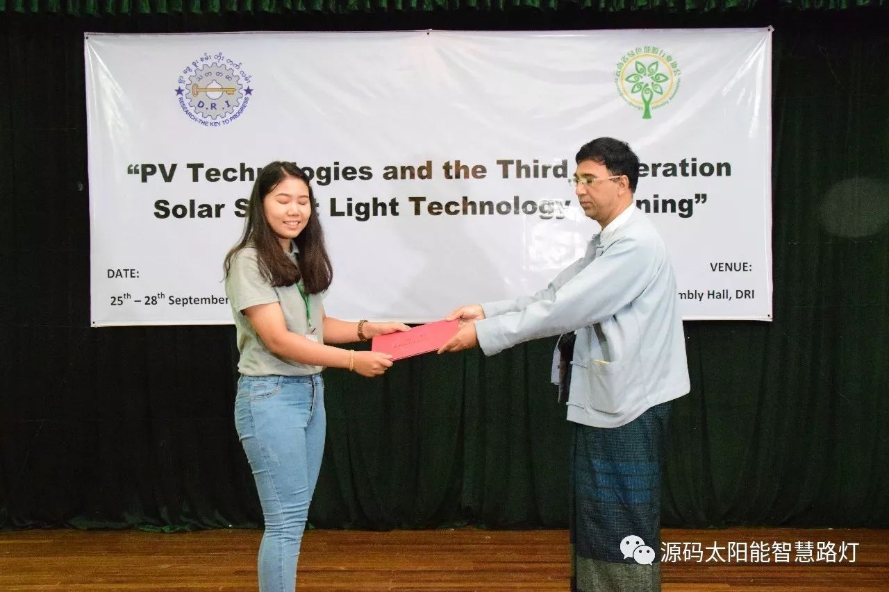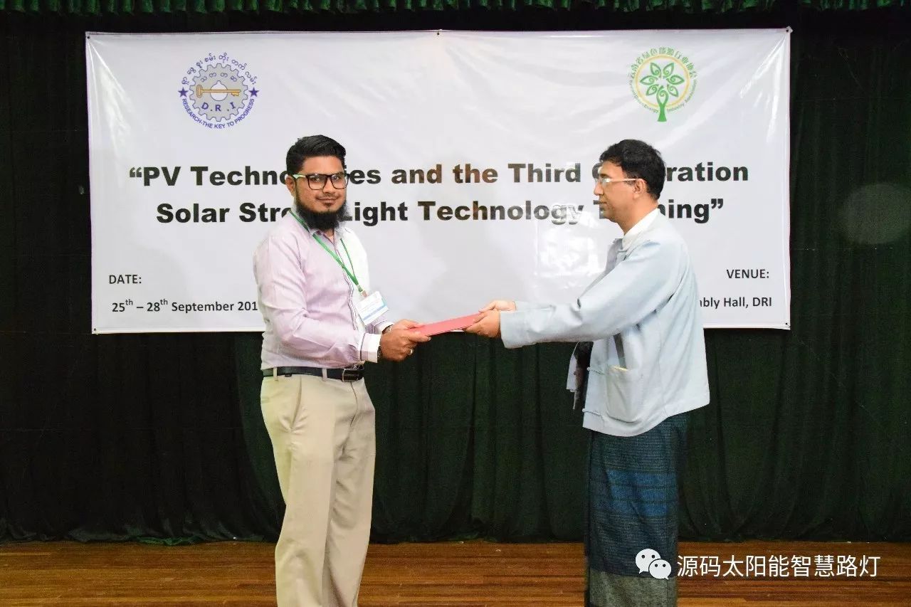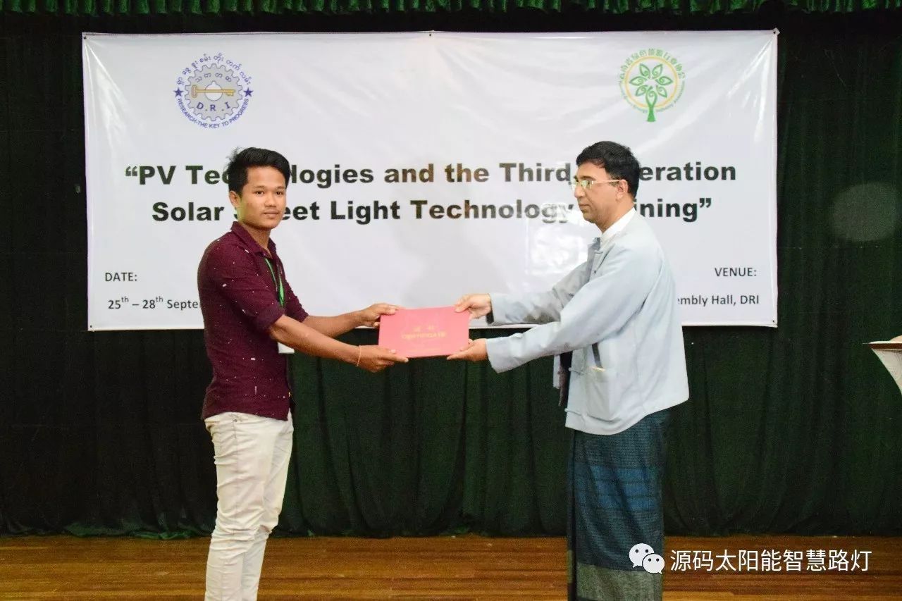 在培訓會議后,大家對此次的培訓綜合內容及取得的效果進行了深入研討,參與此次培訓的能源部、政府部門的相關人員以及大學教授、企業代表都對此次培訓會的效果表示滿意,也希望以后能有更多的類似的培訓會,源碼也希望在以后的培訓中能夠給他們帶來更好的效果。研討會后,中國駐緬甸大使館領導對本次會議作了總結:對本次培訓會議的培訓方云南省綠色能源行業協會以及源碼太陽能智慧路燈表示感謝,表示此次會議對雙方的技術交流學習以及中緬兩國友誼的加深都取到了十分良好的效果。接著緬甸教育部科技司司長則親自向所有通過考試的學員頒發了證書,在頒獎過程中,源碼也向緬甸教育部科技司捐贈了兩套太陽能智慧路燈。