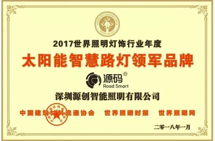 源碼榮獲“太陽能智慧路燈領軍品牌”榮譽
